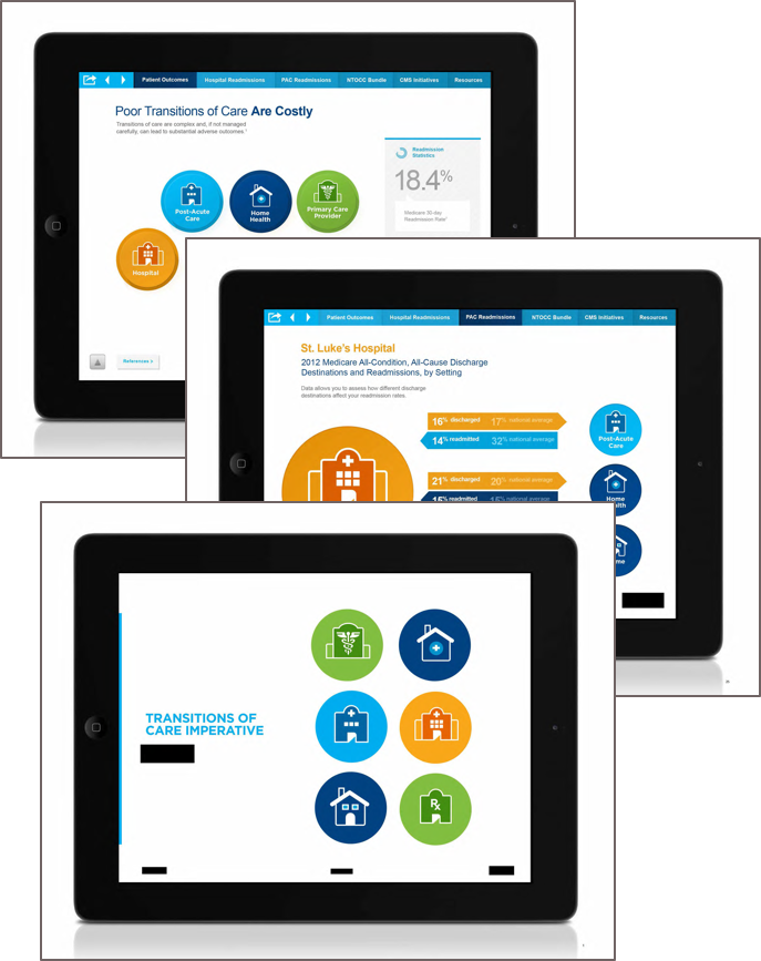 Once we achieved agreement on the overarching strategy, we began to work with the managed markets marketing team to create a narrative that would allow them to engage with their customers on effective transitions of care. To this end, we developed a Veeva-based iPad application that would pull in customer-specific readmissions data (for 2,000+ targeted health systems and hospitals), showing where each facility was having issues with readmissions. We developed case studies and a full suite of materials that the field teams could then use with their customers to help solve for the readmissions challenges based on industry-accepted best practices for care coordination.